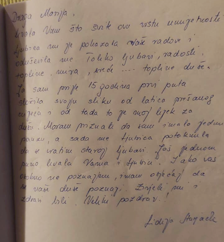 hvala Vam što širite ovu vrstu umjetnosti. Ljubica mi je pokazala Vaše radove i oduševila me. Toliko ljubavi, rdosti, topline, mira, sreće …. topline duše.